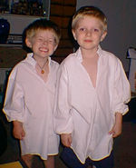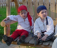 POOFY SHIRTS FOR BOYS IN 5 EASY STEPS I was in a bit of a bind about two weeks ago when I realized that my sons had outgrown their garb from last year. I pretty much panicked. Especially when they looked at me with those gorgeous blue eyes and said, "Mommy, we wanna be PIRANTS!" (They're 3 & 4...we allow them their quirky childhood mispronunciations.) So, I thought and thought about an easy way to create some good garb for them on a very strict and nonexistent budget. The cheapest place I found for children's garb claimed that what I wanted would cost about $100 for the two outfits. HA! Double HA! Don't they know I'm a performer? In the midst of talking to a good friend of mine, I discovered that she had come across the same problems, only it was for her boyfriend and not for any kids. She passed along some great tips that she came up with and I'm going to pass them along to you. Mothers of small boys everywhere will kiss my feet! Actually, you can just have your sons kiss my hands...you don't wanna go near the feet... I spent about two or three days on a whirlwind spree of the local Goodwills and Salvation Armies with my buddy in tow (who was having more fun than I'd ever imagine a childless adult to have!) and we came up with some great finds. For about $20 total, we found four vests (women's in small sizes...perfect for pirates), three pairs of pants (mostly leggings), head scarves (from Hobby Lobby), two pairs of boots (brown leather combat type), as well as "pouches" (small purses), leather belts and yes, we even found tankards! The greatest find of all were two oxford shirts that were about 6 - 8 sizes too big for my kids. And the point of this article is to tell you why. See, an oxford shirt is just a very modernized poofy. With a few simple snips here and there, a bit of thread and some elastic, you can turn this oxford BACK into it's original poofy state! Yes! And I did two of them in the span of an hour and a half! (That's where you gasp and claim it can't be done...) Yes, it can! Follow these steps and you, too, will be a very happy person with poofy shirts galore!