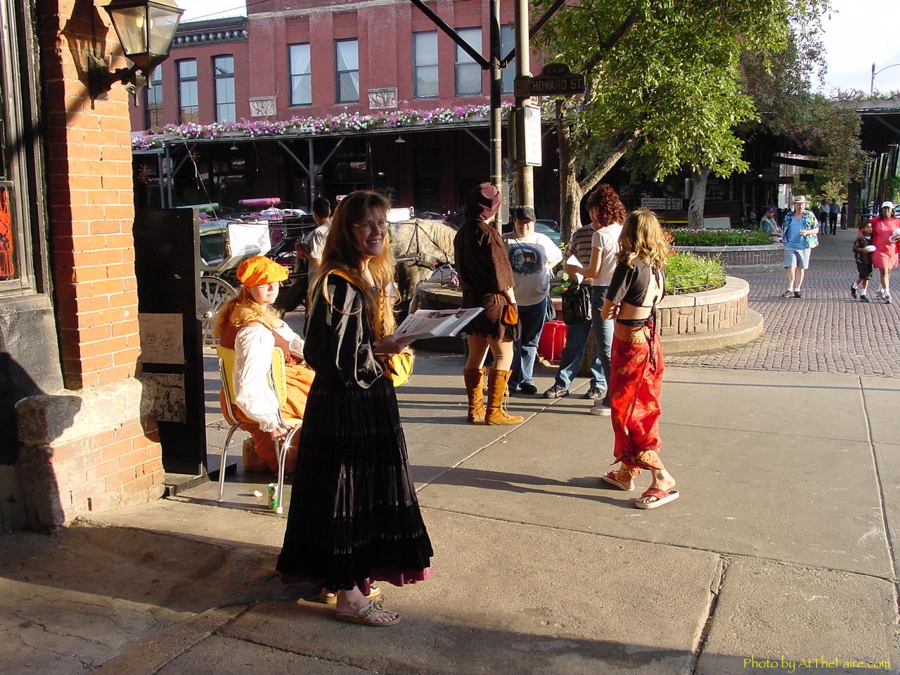Leslie (Firecat's Cauldron) is the task mistress for the Nishna River Renaissance Faire. She was also in charge of posters and flyers. You can see Willa sitting down, and Les' daughter Malorie (red) as they watch Jeff entertain more people.
